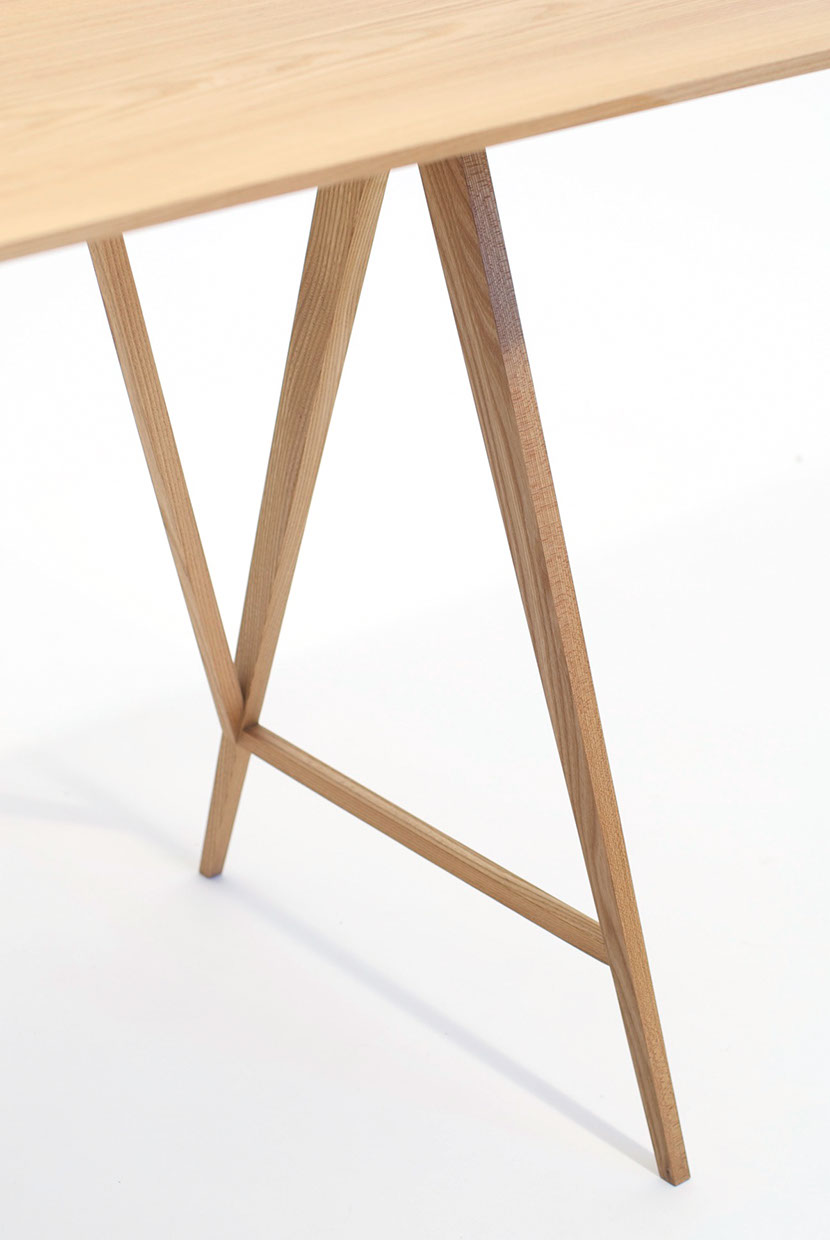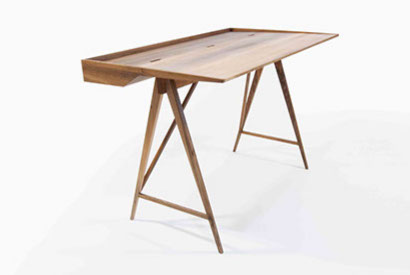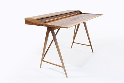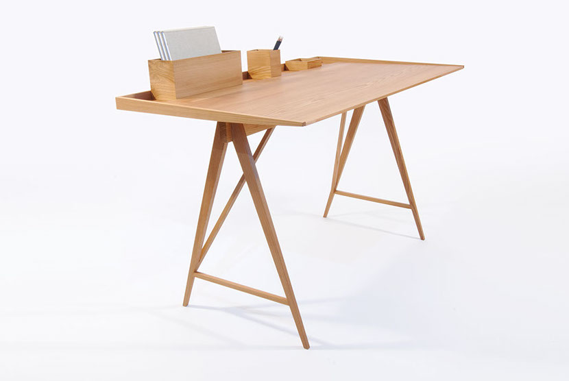 Eine erhöhte Umrandung der Arbeitsfläche sorgt dafür, dass Papier und Stift an Ort und Stelle bleiben. Das Untergestell des Sekretärs ist eine filigrane Neuinterpretation der traditionellen Holzböcke.