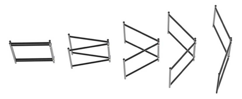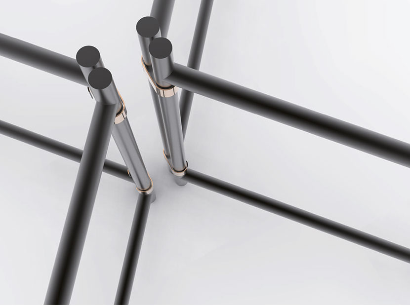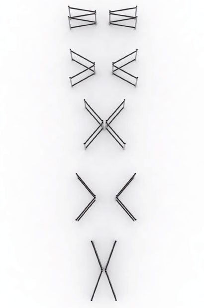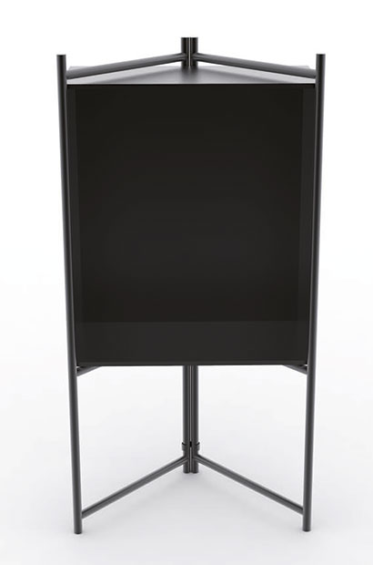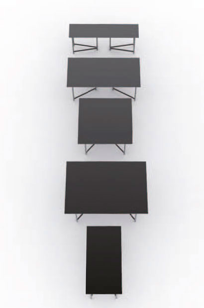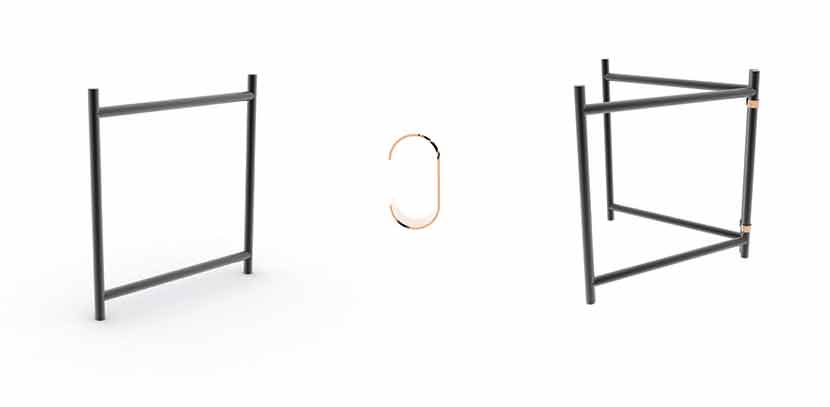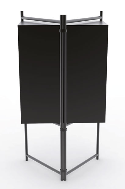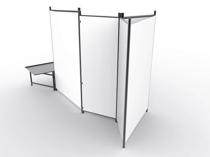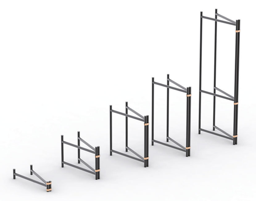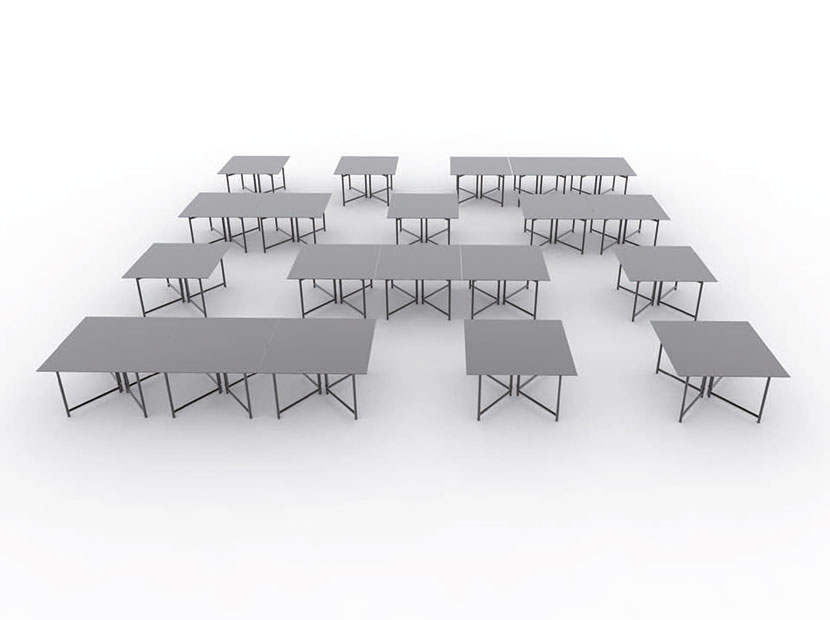 Dieses Ausstellungsmodul fällt durch seine reduzierte Formensprache und vielfältigen Einsatzbereich auf. Die zwei Grundelemente, welche das Untergestell bilden, sind identisch und werden auf einer Seite mit zwei Klammern zusammengehalten. Durch die Klammern kann der Winkel der Grundelemente je nach Einsatz individuell der Tischplatte angepasst werden.